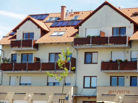 Jednotlivé bloky po 8-9 bytech byly vybaveny již v počátku realizace výstavby bytů solárními zásobníky o objemu 1000 l. Celkem čtyři bloky bytů, vždy po 15 ks vakuových trubicových kolektorů SANMAX 15T a jeden blok s 6 byty a 11 ks kolektorů SANMAX 15T, jsou zapojeny do výše zmíněných zásobníků s dohřevem plynovými kondenzačními kotli.